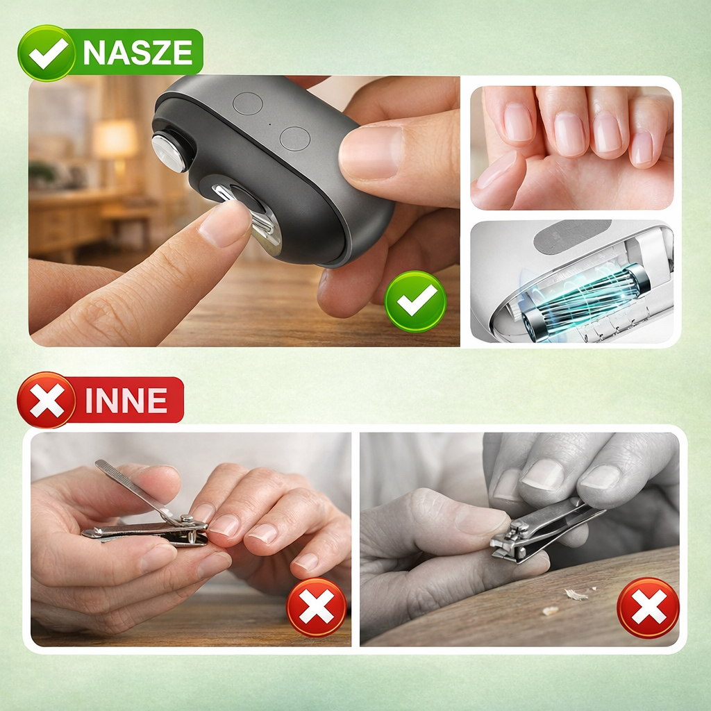 Zapomnij o tradycyjnych obcinaczkach! Nasze urządzenie automatycznie przycina i delikatnie szlifuje paznokcie w jednym płynnym kroku. Wyposażone w supercichy silnik, inteligentny system ochrony przed zacięciem oraz wbudowany, pojemny schowek na ścinki. Pielęgnacja jeszcze nigdy nie była tak szybka, bezpieczna i całkowicie czysta!